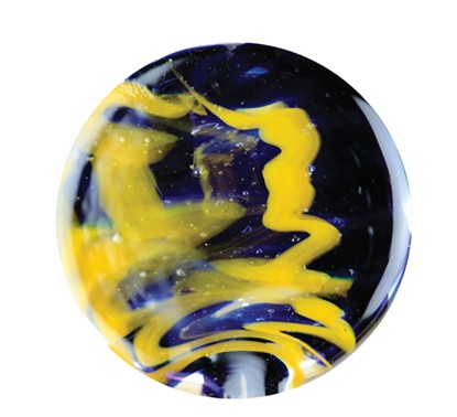 Dieser farbenfrohe Multifarbe-Stab hat dicke – gelbe und tief-blaue Streifen. Umhüllt lässt er sich gut bearbeiten und schmilzt leicht und glatt. Wenn diese Farbe über Momkas Obsidian gelegt wird – scheint es – als schwebe die gelbe Struktur. Verwenden Sie Stringer für Latticino – Streifen und Verwirbelungen.